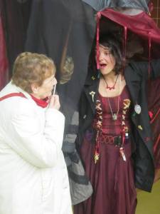 Miss Bouillon porte un grand manteau qui est en réalité sa bibliothèque olfactive.