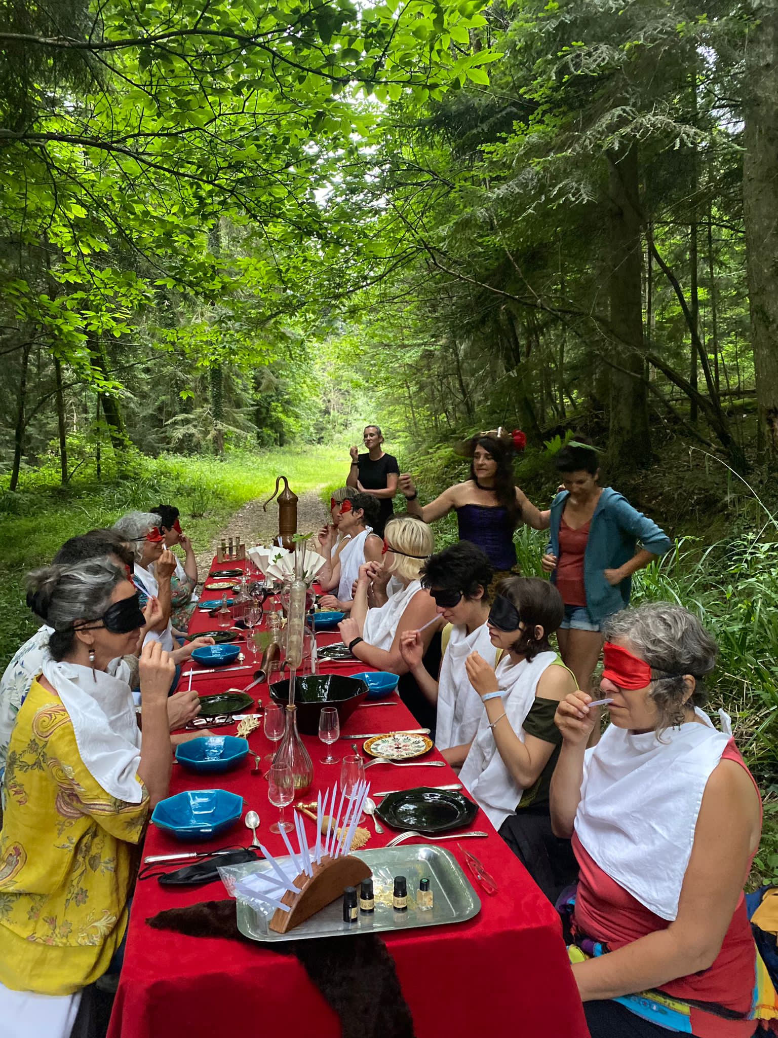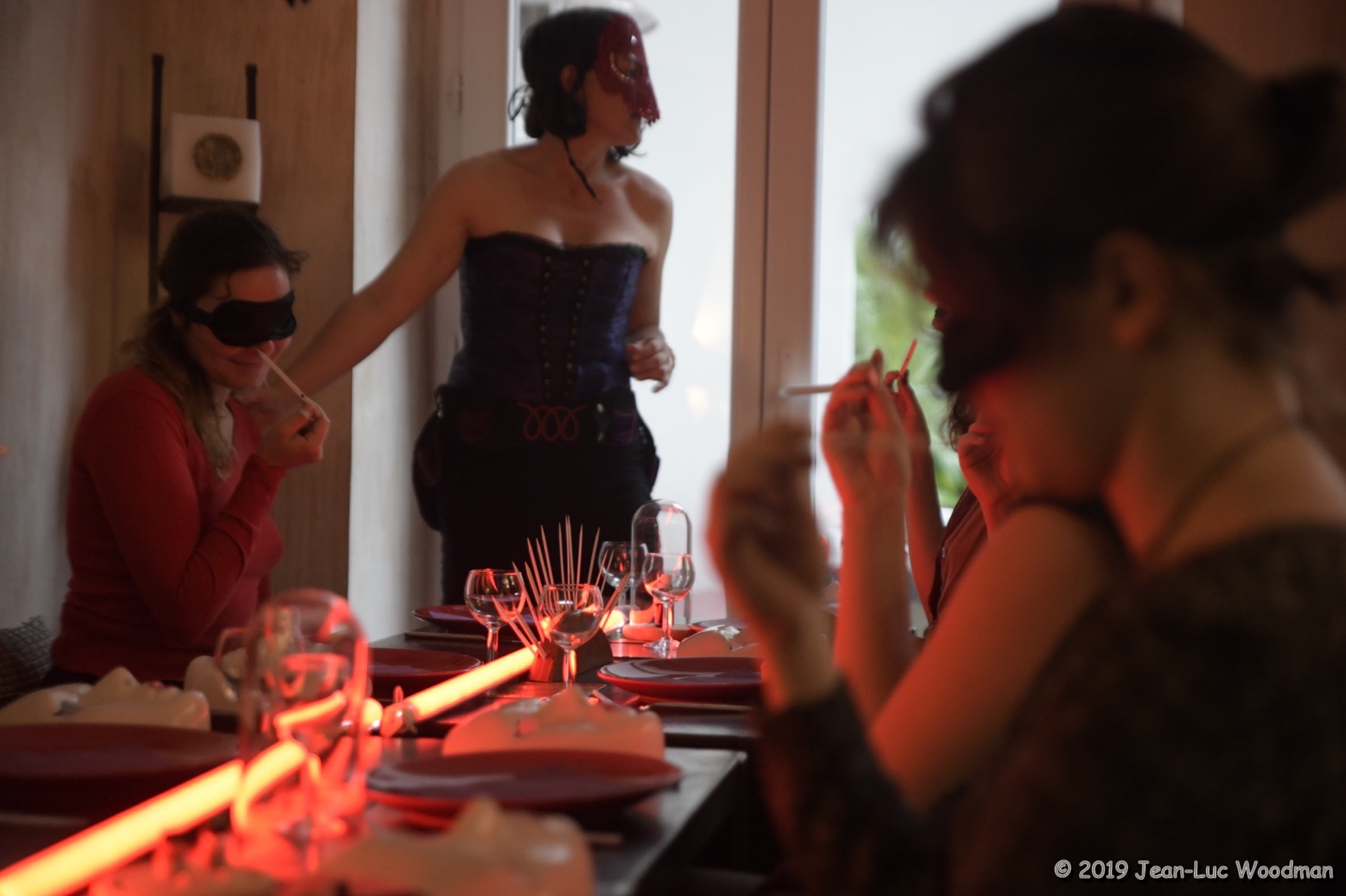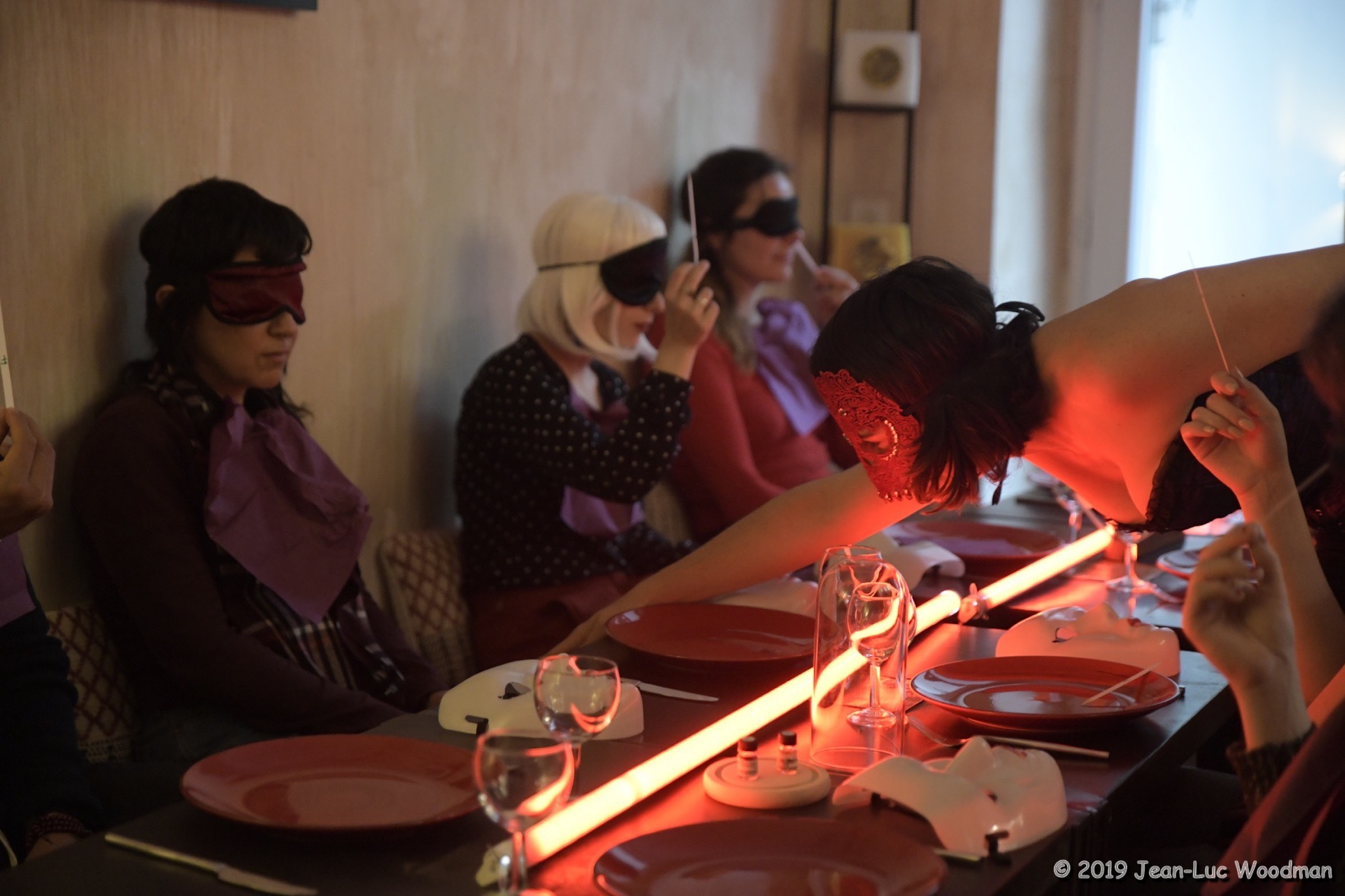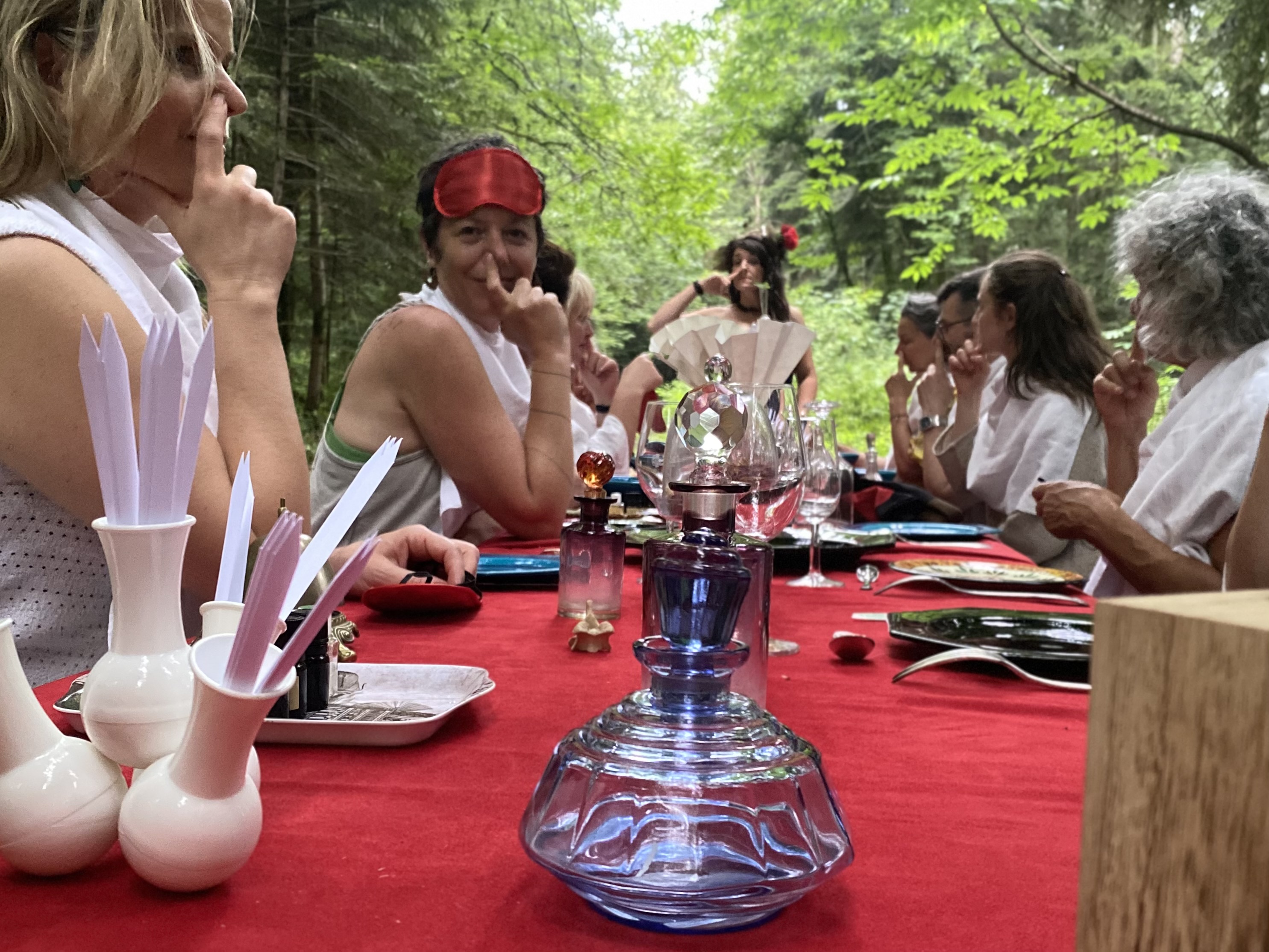 Bienvenue au Banquet d’Odeurs! Vous êtes aujourd’hui conviés à manger le monde par les narines.Votre table vous attend avec un menu d’exception. Des plats raffinés et des vins de grands crus vous sont servis sous forme de parfums. Par le biais d’un jeu olfactif, les maîtresses de cérémonie vous invitent à faire résonner entre eux les arômes qui composent votre entrée, votre plat et votre dessert pour un voyage inédit au coeur des espaces-temps de votre mémoire olfactive! Pour cette célébration collective , chaque met est accompagné de son histoire en sauce. Nous apportons également un grand soin à votre parole olfactive et à vos échanges durant cette ivresse. Bon appétit!